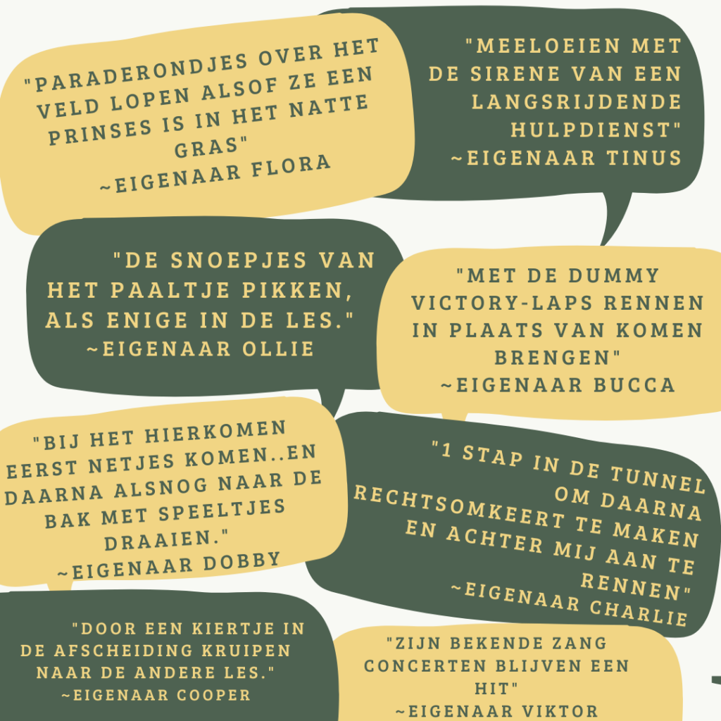 Tijdens de trainingen gebeuren er natuurlijk ook de nodige hilarische dingen. In het eindejaarsonderzoek vroegen we cursisten wat het grappigste was dat hun hond tijdens een training had gedaan. De antwoorden liepen uiteen van meeloeien met een sirene tot stiekem snoepjes van een paaltje pikken. Eén ding is zeker: met honden trainen is niet alleen leerzaam, maar ook nooit saai🤣.