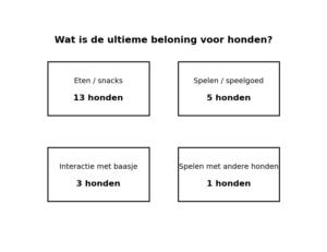 Als we kijken naar de ultieme beloning voor honden, dan blijkt eten vaak favoriet. Dingen als kaas, kip, hondenworst en andere snacks werden het meest genoemd. Maar ook spelen met een bal of speeltje scoort hoog. En voor sommige honden is de grootste beloning simpelweg samen iets doen met hun baasje.