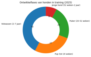 In het eindejaarsonderzoek over de hondentrainingen zien we een mooie spreiding in de ontwikkelfases waarin honden trainen. De grootste groep uit de enquêtedeelnemers bestaat uit volwassen honden, maar ook pups en pubers zijn goed vertegenwoordigd. Dat sluit mooi aan bij onze cursusopbouw: van jonge pups die de eerste stappen zetten in training naar jonge tot volwassen honden die hun vaardigheden verder ontwikkelen in vervolg- en specialisatiecursussen.